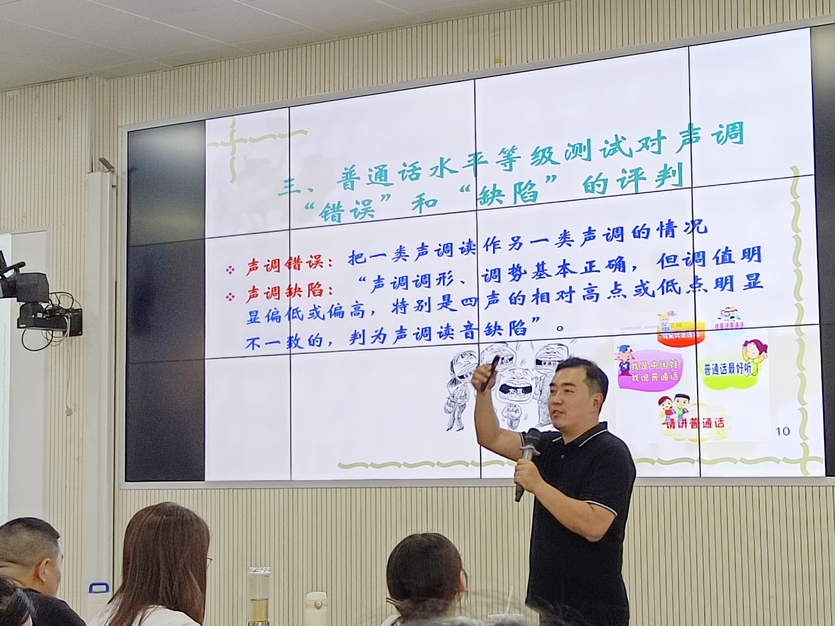 在为期两天的培训中,王浩围绕普通话口语过关测试,主讲了声母、韵母、声调、音变及测前培训等内容。他不仅深入讲解了普通话的发音要领和规律,还通过实例演示和互动练习,有效提升了参训教师的发音技巧和语音理解。