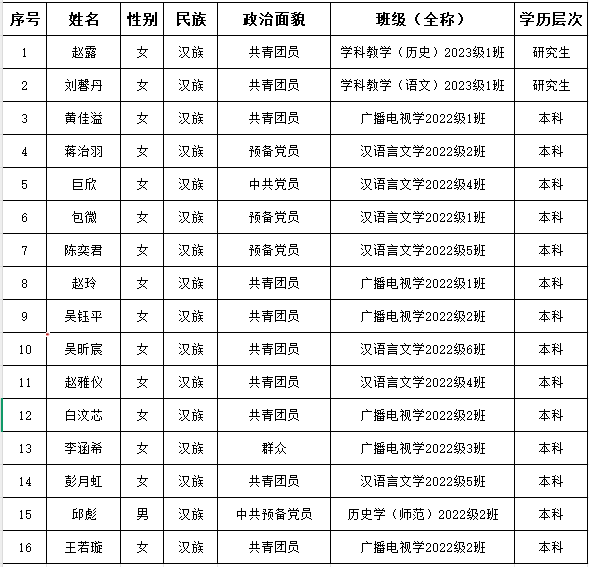 根据《四川省教育厅办公室关于做好2026届四川省普通高等学校优秀毕业生评选推荐工作的通知》要求,参照《四川省普通高等学校优秀毕业生评选认定办法》(川教函〔2020〕622号)、《四川轻化工大学“优秀毕业生”评定办法》(川轻化〔2020〕1号)、《四川轻化工大学研究生优秀毕业生评定办法》(川轻化〔2023〕54号)有关规定以及《四川轻化工大学关于开展2026届优秀毕业生评选工作通知》(川轻化学〔2025〕3号)有关规定,经学生本人申请,学院评审,拟推荐赵露等16名同学为四川省优秀毕业生,现将名单予以公示,公示期2025年11月10日至11月14日。公示期间,若有异议,请到第四实验楼818、819办公室如实反映情况或实名电话0813-5505911,逾期不再受理。