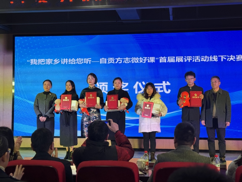 为促进国家通用语言文字推广普及,进一步发挥基地在传承弘扬中华优秀传统文化领域的引领作用,2025年11月28日下午,由自贡市地方志办公室、自贡市教育和体育局、国家语言文字推广基地(四川轻化工大学)、四川轻化工大学人文学院、自贡市融媒体中心共同主办的“我把家乡讲给您听—自贡方志微好课”首届展评活动决赛,在四川卫生康复职业学院举行。十强选手联袂登场,通过精心制作的视频汇报与生动活泼的现场讲述,深刻诠释了自贡的盐业历史、红色文化与文化遗产,为现场观众带来了一场精彩的盐都文化视听盛宴。本次比赛特邀基地专家王益教授承担现场评审工作。四川轻化工大学人文学院副院长陈家春教授,基地秘书、选手指导老师潘俊凯出席活动现场。