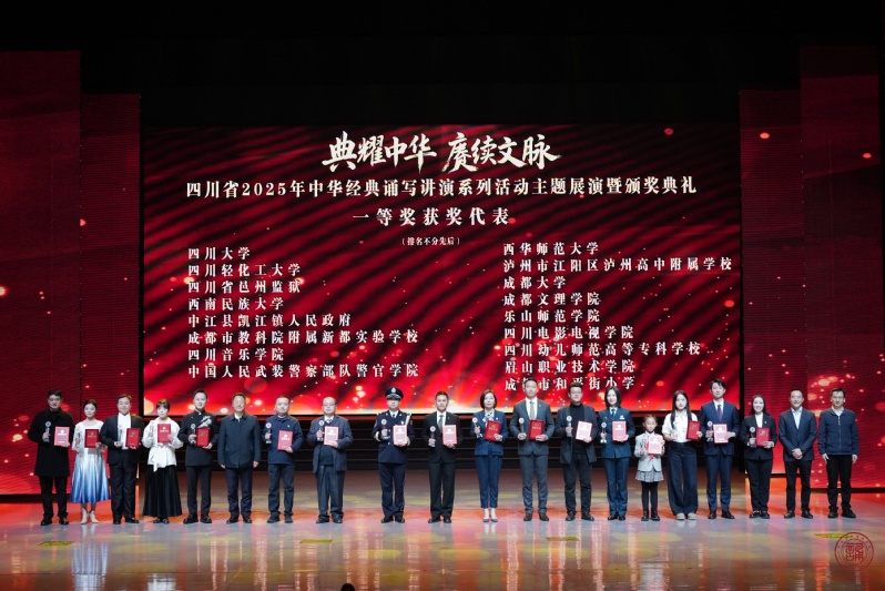 2025年11月28日,由中共四川省委宣传部、中共四川省委教育工作委员会、四川省教育厅、四川省精神文明建设办公室、四川省语言文字工作委员会联合主办的四川省2025年中华经典诵写讲演系列活动颁奖典礼暨主题展演在成都大学隆重举行。我校凭借在多个赛项中的卓越表现,斩获多项大奖,充分展现了我校在传承与弘扬中华优秀传统文化方面的深厚文化底蕴与扎实工作成效。