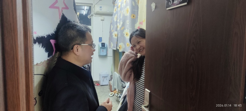 期末备考冲刺与寒假离校工作同步推进,为缓解同学们期末焦虑、筑牢宿舍安全防线、保障平安返乡,1月14日晚,人文学院党委副书记、纪委书记王重云和各教学系教师代表、全体辅导员组成走访小组,在汇南校区开展全覆盖式宿舍走访,为同学们送上暖心关怀与安全提醒。