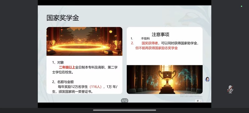 宣讲会上,鄢雨婷老师强调,“暖冬行”与“母校行”虽同属社会实践活动,但二者侧重点不同。“暖冬行”聚焦于资助政策宣讲,致力于缓解家庭经济困难学生的就学压力,推动教育公平。鄢老师系统介绍了“奖、勤、助、贷、减、补”多元一体的资助体系,重点解读了国家奖学金、国家励志奖学金的申请条件、资助标准及评奖冲突处理规则,同时详细说明了勤工助学、国家助学金、助学贷款等相关政策。此外,她也介绍了学校设立的优秀学业奖学金、筑梦奖学金等特色资助项目,并对研究生相关资助政策作了说明。