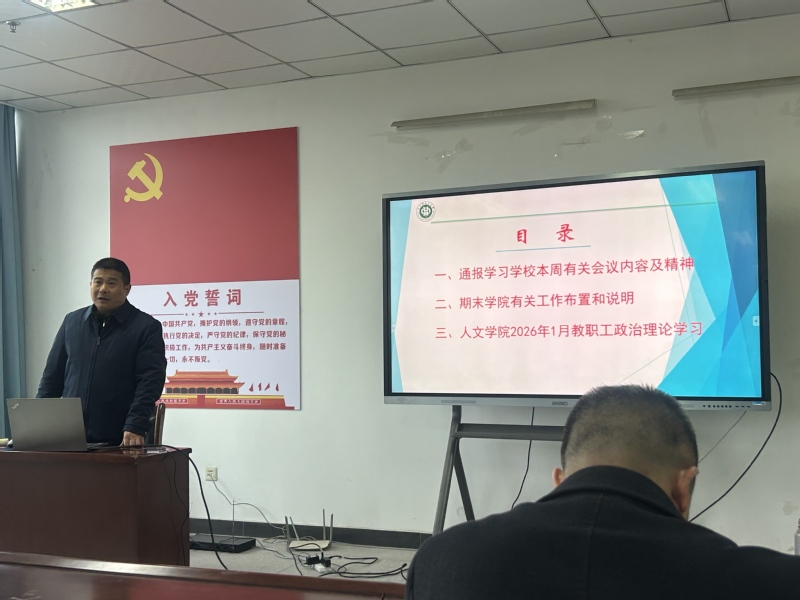 根据学校下发的《关于2026年1月教职工政治理论学习安排的通知》,由杨长牛领学,全体教职工集中学习了习近平总书记重要文章《学习贯彻好党的二十届四中全会精神》、习近平总书记在中共中央政治局民主生活会上的重要讲话精神、中共中央政治局研究部署党风廉政建设和反腐败工作会议精神、1月8日召开的中共中央政治局常务委员会会议精神、习近平总书记在二十届中央纪委五次全会上的重要讲话精神、2026年全国教育工作会议精神,并布置了会后教职工自学的内容。