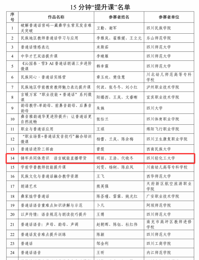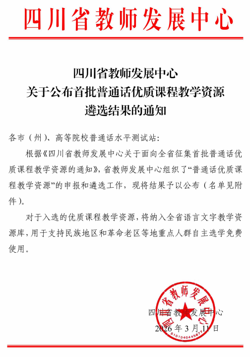 近日,四川省教师发展中心正式公布了首批普通话优质课程教学资源遴选结果。由我校人文学院明丽、王浩、代晓冬三位老师组成的教学团队所申报的《铸牢共同体意识 语言赋能直播带货》课程,凭借其创新性和实用性,成功入选四川省首批语言文字教学资源库。
