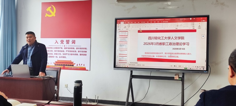 3月18日下午,人文学院在汇东校区第四实验楼802会议室组织2026年3月教职工政治理论集中学习。集中学习由学院党委书记杨长牛主持,全院教职工参加了学习。