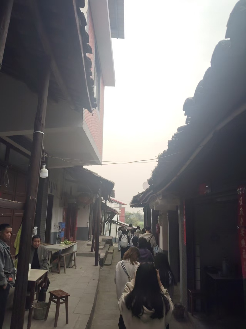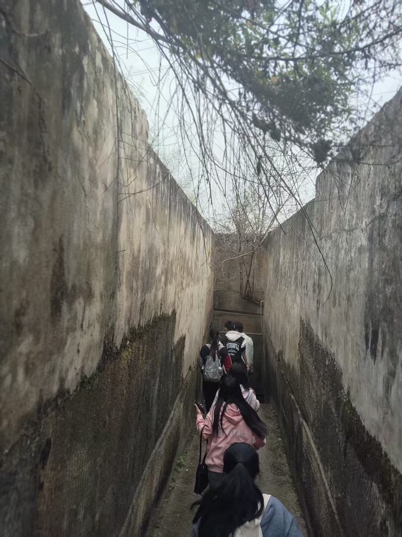跟随孙教授,同学们穿过寨门,步入青石铺就的巷道。指尖抚过斑驳的寨墙,目光停留在融合了川南穿斗与徽派马头墙的建筑上。“建筑是凝固的历史”,孙教授讲解道,“一砖一木,都诉说着移民与本土文化的交融”。同学们或蹲身观察基石,或仰头研究梁架,在实物的细节中,对照、印证书本上的知识。