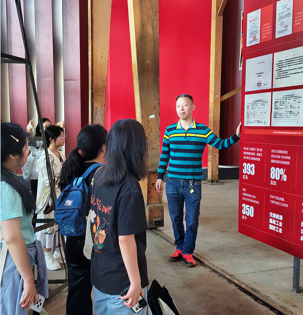 当长征机床厂的红色厂房映入眼帘,时光仿佛倒流回1965年的那个夏天。孙教授站在斑驳的“艰苦奋斗”标语前给同学们讲述到:“当年北京第一机床厂的技术员们,背着铺盖卷跨越半个中国,用‘三快经验’在荒坡上建起西南工业的脊梁。”同学们抚摸着车间里锈迹斑斑的机床,仿佛能触摸到老一辈建设者掌心的温度——那是“为国担当”的信念,在钢铁与汗水的淬炼中愈发滚烫。